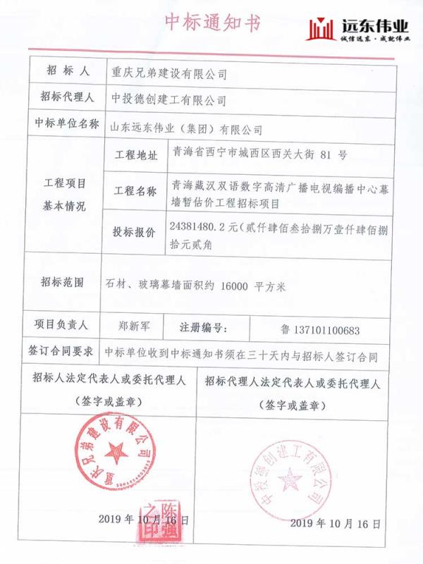 青海藏漢雙語(yǔ)數(shù)字高清廣播電視編播中心幕墻工程、中標(biāo)通知書(shū)(鄭新軍) ... 產(chǎn)品詳情 上一條:泰安文旅健身中心 下一條: 暫無(wú) 推薦產(chǎn)品 黃海明珠中心 濟(jì)寧運(yùn)河城 開(kāi)發(fā)區(qū)萬(wàn)達(dá)廣場(chǎng) 中國(guó)重汽濟(jì)寧商用車有限公司